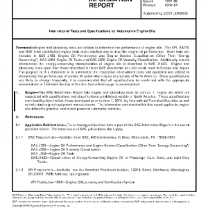 This SAE Information Report lists engine and laboratory tests for service fill engine oils which are associated with specifications and classifications established outside of North America. These specifications and classifications include those developed prior to June 1, 2001, by International Technical Societies as well as individual original equipment manufacturers. The information contained within this report applies to engine oils utilized in gasoline and diesel powered automotive vehicles.