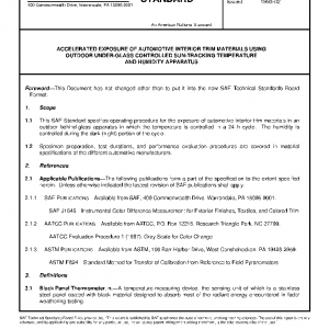 This SAE Standard specifies operating procedure for the exposure of automotive interior trim materials in an outdoor behind-glass apparatus in which the temperature is controlled in a 24 h cycle. The humidity is controlled during the dark (night) portion of the cycle.