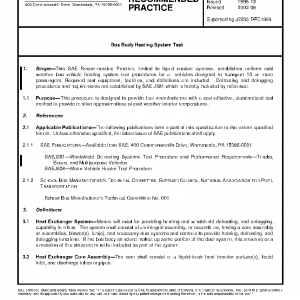This SAE Recommended Practice, limited to liquid coolant systems, establishes uniform cold weather bus vehicle heating system test procedures for all vehicles designed to transport 10 or more passengers. Required test equipment, facilities, and definitions are included. Defrosting and defogging procedures and requirements are established by SAE J381 which is hereby included by reference.