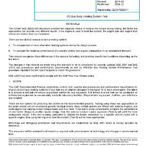 This SAE Recommended Practice establishes uniform cold weather test procedures and performance requirements for engine coolant type heating systems of bus that are all vehicles designed to transport 10 or more passengers. The intent is to provide a test that will ensure acceptable comfort for bus occupants. It is limited to a test that can be conducted on uniform test equipment in commercially available laboratory facilities. Required test equipment, facilities, and definitions are included.