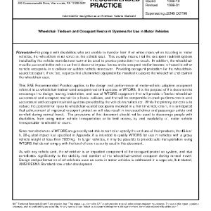 This SAE Recommended Practice applies to WTORS comprised of a system or device for wheelchair tiedown and a system or device for restraining the wheelchair-seated occupant. It specifies design requirements, test methods, and performance requirements for WTORS, requirements for manufacturer’s instructions to installers and users, and requirements for product marking and labeling. This document places particular emphasis on design requirements, test procedures, and performance requirements for the dynamic performance of WTORS in a 48-km/h, 20-g frontal impact. It also specifies test procedures and performance requirements for webbing slippage at adjustment devices of strap-type wheelchair tiedowns, and for partial but ineffective engagement of wheelchair tiedowns, and tiedown components that could be perceived to be effectively engaged. Appendix F includes additional recommendations for WTORS that will enhance the design, performance, installation, and use of WTORS, but which are not, at this time, required for compliance with this document.