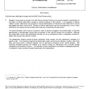 The purpose and scope of this SAE Recommended Practice is to provide a basis for classification of the extent of vehicle deformation caused by vehicle accidents on the highway. It is necessary to classify collision contact deformation (as opposed to induced deformation) so that the accident deformation may be segregated into rather narrow limits. Studies of collision deformation can then be performed on one or many data banks with assurance that the data under study are of essentially the same type.1