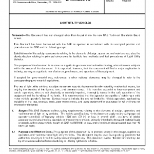 This SAE Standard defines safety requirements relating to the elements of design, operation, and maintenance of light utility vehicles. The safety specifications in this document apply to any self-propelled, operator-controlled, off-highway vehicle 1828 mm (72 in) or less in overall width, exclusive of added accessories and attachments, operable on three or more wheels, primarily intended to transport material loads or people, with a gross vehicle weight of 2268 kg (5000 lb) or less, and a maximum design speed less than 40 km/h (25 mph).
