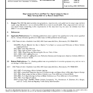 This SAE Standard provides test procedures, requirements, and guidelines for stop lamps and turn signal lamps intended for use on vehicles 2032 mm or more in overall width. Stop lamps and front- and rear-turn signal lamps conforming to the requirements of this document may be used on vehicles less than 2032 mm in overall width.