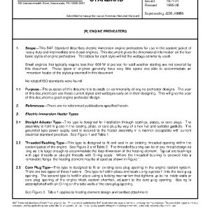 This SAE Standard describes electric immersion engine preheaters for use in the coolant jacket of heavy-duty and intermediate size diesel engines. This document gives the dimensional information on the four basic styles of engine preheaters. The tables for each style will list the wattage commonly used.