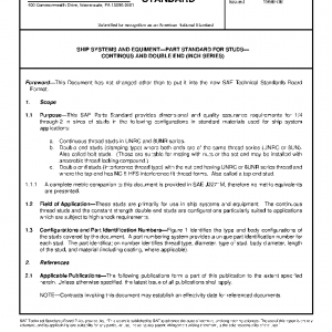 This SAE Parts Standard provides dimensional and quality assurance requirements for 1/4 through 2 in sizes of studs in the following configurations in standard materials used for ship system applications: