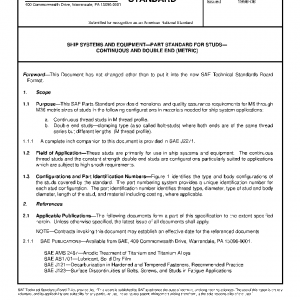 This SAE Parts Standard provides dimensional and quality assurance requirements for M6 through M36 metric sizes of studs in the following configurations in materials needed for ship system applications: