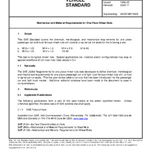 This SAE Standard covers the chemical, metallurgical, and mechanical requirements for one piece passenger car and truck ferrous wheel nuts with conical or spherical nut seats for the following sizes: