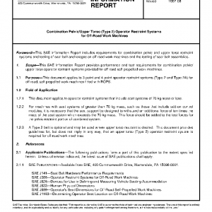This SAE Information Report provides performance and test requirements for combination pelvic/upper torso operator restraint systems provided for off-road self-propelled work machines.