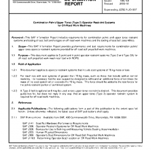 This SAE Information Report provides performance and test requirements for combination pelvic/upper torso operator restraint systems provided for off-road self-propelled work machines.