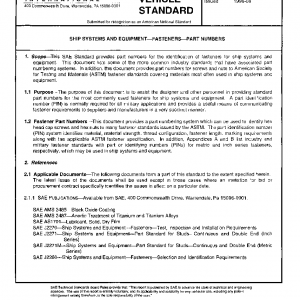 This SAE Standard provides part numbers for the identification of fasteners for ship systems and equipment. This document lists some of the more common industry standards that have associated part numbering systems. In addition, this document provides part numbers for screws and nuts to American Society for Testing and Materials (ASTM) fastener standards covering materials most often used in ship systems and equipment.