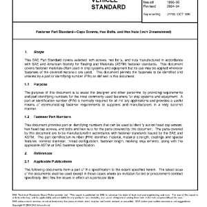 This SAE Part Standard covers selected inch screws, hex bolts, and nuts manufactured in accordance with SAE and American Society for Testing and Materials (ASTM) fastener standards. This document covers fastener materials often used in ship systems and equipment but its use may be applied wherever fasteners of the covered materials are used. This document permits the fasteners to be identified and ordered by a part or identifying number (PIN) as defined in this document.