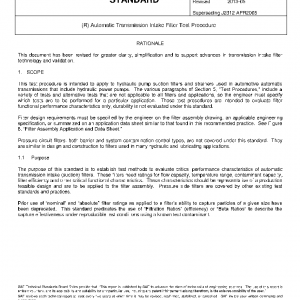 This test procedure is intended to apply to hydraulic pump suction filters and strainers used in automotive automatic transmissions that include hydraulic power pumps. The various paragraphs of Section 5, “Test Procedures,” include a variety of tests and alternative tests that are not applicable to all filters and applications, so the engineer must specify which tests are to be performed for a particular application. These test procedures are intended to evaluate filter functional performance characteristics only, durability is not evaluated under this standard.