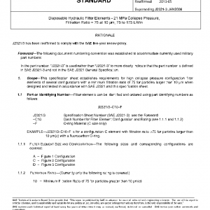 This specification sheet establishes requirements for high collapse pressure configuration filter elements of several configurations with a minimum filtration ratio of 75 for particles larger than 10 µm when designed and tested in accordance with SAE J2321 and this specification sheet.