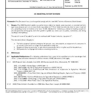 This SAE Standard establishes performance criteria for towed, semi-mounted, or mounted and arm type rotary mowers with one or more blade assemblies of 77.5 cm blade tip circle diameter or over, mounted on a propelling tractor or machine of at least 15 kW, intended for marketing as industrial mowing equipment and designed for cutting grass and other growth in public use areas such as parks, cemeteries, and along roadways and highways.