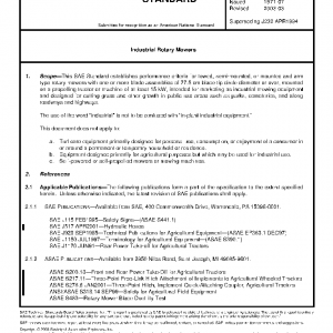This SAE Standard establishes performance criteria for towed, semi-mounted, or mounted and arm type rotary mowers with one or more blade assemblies of 77.5 cm blade tip circle diameter or over, mounted on a propelling tractor or machine of at least 15 kW, intended for marketing as industrial mowing equipment and designed for cutting grass and other growth in public use areas such as parks, cemeteries, and along roadways and highways.