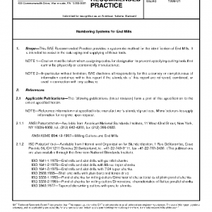 This SAE Recommended Practice provides a systematic method for the identification of End Mills. It is intended to assist in the cataloging and supplying of these tools.