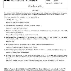 This SAE Standard defines the safety and performance requirements for Low Speed Vehicles (“LSV”). The safety specifications in this document apply to any powered vehicle with a minimum of 4-wheels, a maximum level ground speed of more than 32 km/h (20 mph) but not more than 40 km/h (25 mph),), and a maximum gross vehicle weight of 1361 kg (3000 lb), that is intended for operating on designated roadways where permitted by law.