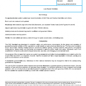 This SAE Standard defines the safety and performance requirements for low-speed vehicles (LSVs). The safety specifications in this document apply to any powered vehicle with a minimum of four wheels, a maximum level ground speed of more than 32 km/h (20 mph) but not more than 40 km/h (25 mph), and a maximum gross vehicle weight of 1361 kg (3000 pounds), that is intended for operating on designated roadways where permitted by law.