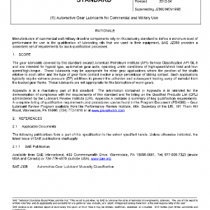 The gear lubricants covered by this standard exceed American Petroleum Institute (API) Service Classification API GL-5 and are intended for hypoid type, automotive gear units, operating under conditions of high-speed/shock load and low-speed/high-torque. These lubricants may be appropriate for other gear applications where the position of the shafts relative to each other and the type of gear flank contact involve a large percentage of sliding contact. Such applications typically require extreme pressure (EP) additives to prevent the adhesion and subsequent tearing away of material from the loaded gear flanks. These lubricants are not appropriate for the lubrication of worm gears.