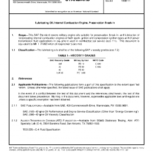 This SAE Standard covers military engine oils suitable for preservation, break-in, and lubrication of reciprocating internal combustion engines of both spark-ignition and compression-ignition types and of power transmission fluid applications in equipment used in combat/tactical service (see 7.1). This document is equivalent to MIL-L-21260 when all requirements are met.