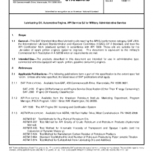 This SAE Standard describes lubricating oils meeting the API SJ performance category, SAE J300, the International Lubricant Standardization and Approval Committee (ILSAC) GF-2 Standard, and bear the API Certification Mark (starburst symbol) in accordance with API 1509. These oils are suitable for the lubrication of spark-ignition engines (gasoline engines). This document is equivalent to the military’s Commercial Item Description A-A-52039 when all requirements are met.