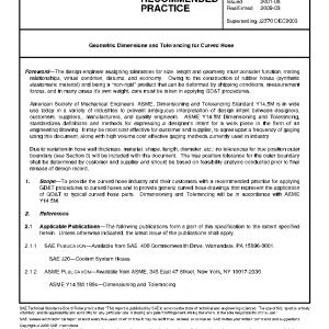 To provide the curved hose industry and their customers with a recommended practice for applying GD&T procedures to curved hoses and to provide generic curved hose drawings that represent the application of GD&T to typical curved hose parts. Dimensioning and Tolerancing will be in accordance with ASME Y14.5M.