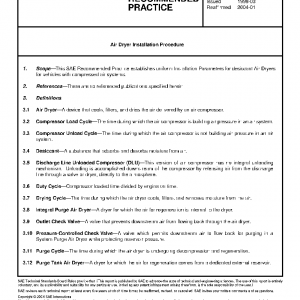 This SAE Recommended Practice establishes uniform Installation Parameters for desiccant Air Dryers for vehicles with compressed air systems.