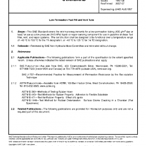 This SAE Standard covers the minimum requirements for a low-permeation tubing (100 g/m2·day or less) for use as a low pressure (14.5 kPa) liquid- or vapor-carrying component for use in gasoline or diesel fuel filler, vent, and vapor systems. The construction shall be designed to be functional over a temperature range of –40 °C to 100 °C for the T1 designation, or –40 °C to 125 °C for the T2 designation.