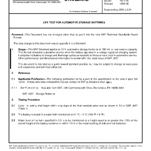 This SAE Standard applies to 12 V, automotive storage batteries of 180 min or less reserve capacity. This life test simulates automotive service when the battery operates in a voltage regulated charging system. It subjects the battery to charge and discharge cycles comparable to those encountered in automotive service. Other performance and dimensional information is contained in the latest issue of SAE J537.