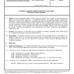 This SAE Standard provides a uniform method to calculate the lift capacity of knuckle-boom log loaders and certain forestry equipment. It establishes definitions and specifies machine conditions for calculations. This document applies to knuckle-boom log loaders as defined in SAE J1209 and SAE J2055 and certain forestry equipment defined in SAE J1209 that have a rotating upper-structure such as feller bunchers, forwarders, harvesters, and behind the cab or rear-mounted knuckle-boom log loaders not having their own power supply. It does not apply to harvesters that are incapable of lifting a tree or log completely off the ground. This document applies to those machines that are crawler, rubber-tired, and pedestal or stationary mounted.