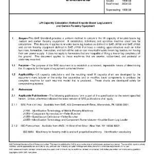 This SAE Standard provides a uniform method to calculate the lift capacity of knuckle-boom log loaders and certain forestry equipment. It establishes definitions and specifies machine conditions for calculations. This document applies to knuckle-boom log loaders as defined in SAE J1209 and SAE J2055 and certain forestry equipment defined in SAE J1209 that have a rotating upper-structure such as feller bunchers, forwarders, harvesters, and behind the cab or rear-mounted knuckle-boom log loaders not having their own power supply. It does not apply to harvesters that are incapable of lifting a tree or log completely off the ground. This document applies to those machines that are crawler, rubber-tired, and pedestal or stationary mounted.