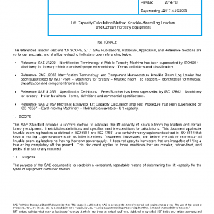 This SAE Standard provides a uniform method to calculate the lift capacity of knuckle-boom log loaders and certain forestry equipment. It establishes definitions and specifies machine conditions for calculations. This document applies to knuckle-boom log loaders as defined in ISO 6814 and ISO 17591 and certain forestry equipment defined in ISO 6814 that have a rotating upper-structure such as feller bunchers, forwarders, harvesters, and behind the cab or rear-mounted knuckle-boom log loaders not having their own power supply. It does not apply to harvesters that are incapable of lifting a tree or log completely off the ground. This document applies to those machines that are crawler, rubber-tired, and pedestal or stationary mounted.