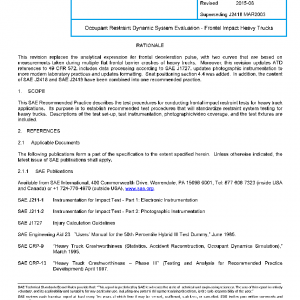 This SAE Recommended Practice describes the test procedures for conducting frontal impact restraint tests for heavy truck applications. Its purpose is to establish recommended test procedures that will standardize restraint system testing for heavy trucks. Descriptions of the test set-up, test instrumentation, photographic/video coverage, and the test fixtures are included.
