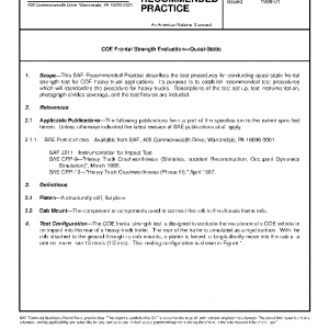 This SAE Recommended Practice describes the test procedures for conducting quasi-static frontal strength test for COE heavy truck applications. Its purpose is to establish recommended test procedures which will standardize the procedure for heavy trucks. Descriptions of the test set-up, test instrumentation, photographic/video coverage, and the test fixtures are included.