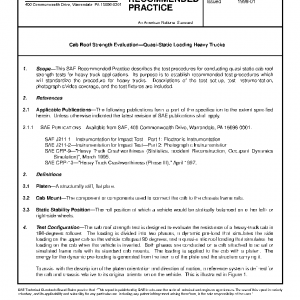 This SAE Recommended Practice describes the test procedures for conducting quasi-static cab roof strength tests for heavy-truck applications. Its purpose is to establish recommended test procedures which will standardize the procedure for heavy trucks. Descriptions of the test set-up, test instrumentation, photographic/video coverage, and the test fixtures are included.