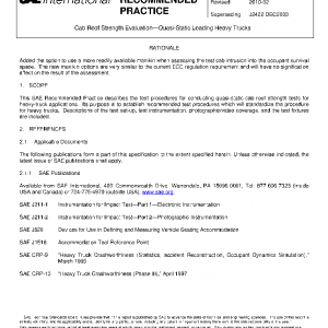 This SAE Recommended Practice describes the test procedures for conducting quasi-static cab roof strength tests for heavy-truck applications. Its purpose is to establish recommended test procedures which will standardize the procedure for heavy trucks. Descriptions of the test set-up, test instrumentation, photographic/video coverage, and the test fixtures are included.