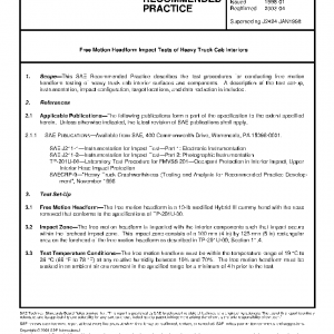 This SAE Recommended Practice describes the test procedures for conducting free motion headform testing of heavy truck cab interior surfaces and components. A description of the test set-up, instrumentation, impact configuration, target locations, and data reduction is included.