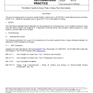 This SAE Recommended Practice describes the test procedures for conducting free motion headform testing of heavy truck cab interior surfaces and components. A description of the test set-up, instrumentation, impact configuration, target locations, and data reduction is included.