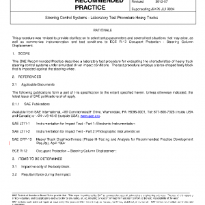 This SAE Recommended Practice describes a laboratory test procedure for evaluating the characteristics of heavy truck steering control systems under simulated driver impact conditions. The test procedure employs a torso-shaped body block that is impacted against the steering wheel.