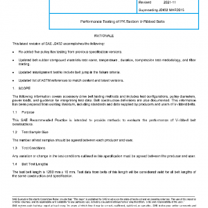 The following information covers accessory drive belt testing methods and includes test configurations, pulley diameters, power loads, and guidance for interpreting test data. Belt construction definitions are also documented. This information has been prepared from existing literature, including standards and data supplied by producers and users of V-ribbed belts.