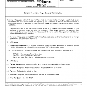 The scope of this SAE Draft Technical Report is to establish dimensional standards for high-performance domestic torque converter manufacturers. Many torque converter manufacturers build converters to their own standards. Some of these standards may be outside of the specifications that define a quality performance torque converter.