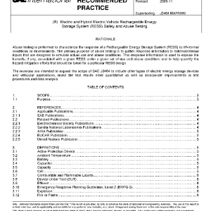 Abuse test procedures in this document are intended to cover a broad range of vehicle applications as well as a broad range of electrical energy storage devices, including individual RESS cells (batteries or capacitors), modules and packs. This document applies to vehicles with RESS voltages above 60 volts. This document does not apply to RESS that uses mechanical devices store energy (e.g., electro-mechanical flywheels).
