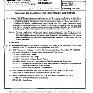 This SAE Standard covers complete general and dimensional specifications for tube fittings of the spherical and flanged sleeve compression types for use in the piping of air brake systems on automotive vehicles. The spherical sleeve compression type Figures 1A to 5 and Tables 1 to 3 is intended for use with annealed copper alloy tubing per SAE J1149, Type 1. The flanged sleeve compression type Figures 6A to 11 and Tables 4 to 6 is intended for use with nylon tubing per SAE J844. It is not intended to restrict or preclude other designs of a tube fitting for use with SAE J844, air brake tubing. Performance requirements for SAE J844 are covered in J1131.