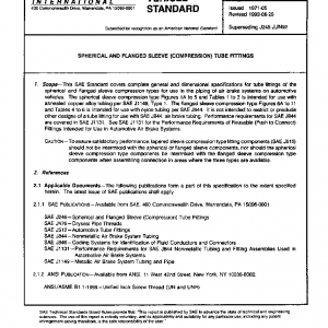 This SAE Standard covers complete general and dimensional specifications for tube fittings of the spherical and flanged sleeve compression types for use in the piping of air brake systems on automotive vehicles. The spherical sleeve compression type Figures 1A to 5 and Tables 1 to 3 is intended for use with annealed copper alloy tubing per SAE J1149, Type 1. The flanged sleeve compression type Figures 6A to 11 and Tables 4 to 6 is intended for use with nylon tubing per SAE J844. It is not intended to restrict or preclude other designs of a tube fitting for use with SAE J844, air brake tubing. Performance requirements for SAE J844 are covered in SAE J1131. See SAE J1131 for the Performance Requirements of Reusable (Push to Connect) Fittings Intended for Use in Automotive Air Brake Systems.