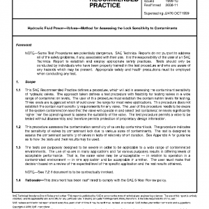 This SAE Recommended Practice defines a procedure, which will aid in assessing the contaminant sensitivity of hydraulic valves. The approach taken defines a test procedure with flexibility for testing valves in a wide range of contamination levels. The user of this procedure must establish the contamination levels for testing. Three levels are suggested which should cover the range for most valve applications. This procedure does not establish the contaminant sensitivity requirements for any valve. The user of this procedure needs to be aware of the system contamination level that the valve will operate in and select test contamination levels significantly higher than the operating level to assess the suitability of the valve. The test procedure permits a valve to be tested without disassembly and therefore permits protection of proprietary design information.
