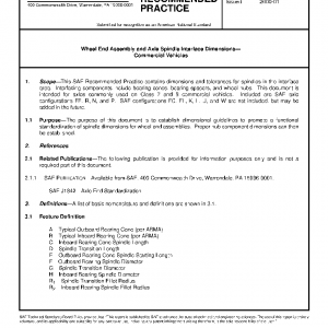 This SAE Recommended Practice contains dimensions and tolerances for spindles in the interface area. Interfacing components include bearing cones, bearing spacers, and wheel hubs. This document is intended for axles commonly used on Class 7 and 8 commercial vehicles. Included are SAE axle configurations FF, R, N, and P. SAE configurations FC, FL, K, L, U, and W are not included, but may be added in the future.