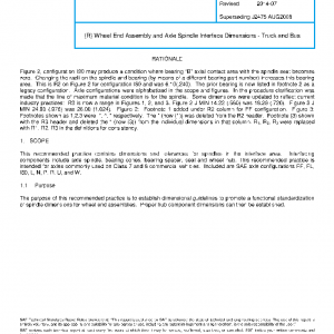 This recommended practice contains dimensions and tolerances for spindles in the interface area. Interfacing components include axle spindle, bearing cones, bearing spacer, seal and wheel hub. This recommended practice is intended for axles commonly used on Class 7 and 8 commercial vehicles. Included are SAE axle configurations FF, FL, I80, L, N, P, R, U, and W.