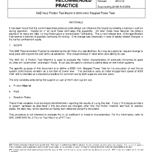 The specific purpose of this document is to define a 6000 r/min Stepped Power Test for the evaluation of wet friction system performance variation as a function of power level. This procedure uses an initial engagement speed of 6000 r/min and is intended as a standard procedure for common use by both suppliers and end users.