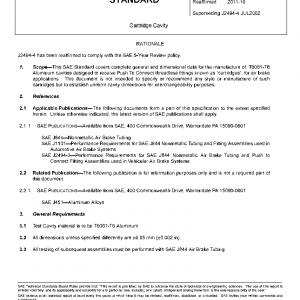 This SAE Standard covers complete general and dimensional data for the manufacture of, T6061-T6 Aluminum cavities designed to receive Push To Connect threadless fittings known as “cartridges“, for air brake applications. This document is not intended to specify or recommend any style or manufacture of such cartridges but to establish uniform cavity dimensions for interchangeability purposes.
